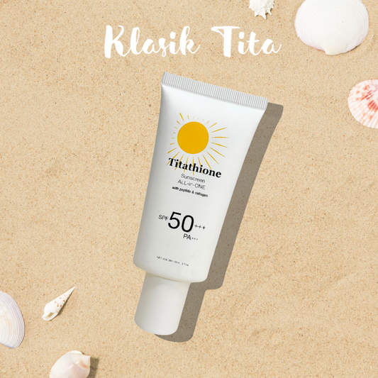 Shield your skin from the harsh rays of the sun with Shaheen Beauty TITATHIONE Sunscreen Spf 50/PA+++ w/ Zinc Oxide, Titanium Dioxide and Niacinamide, a potent all-in-one solution for sun protection and skincare.