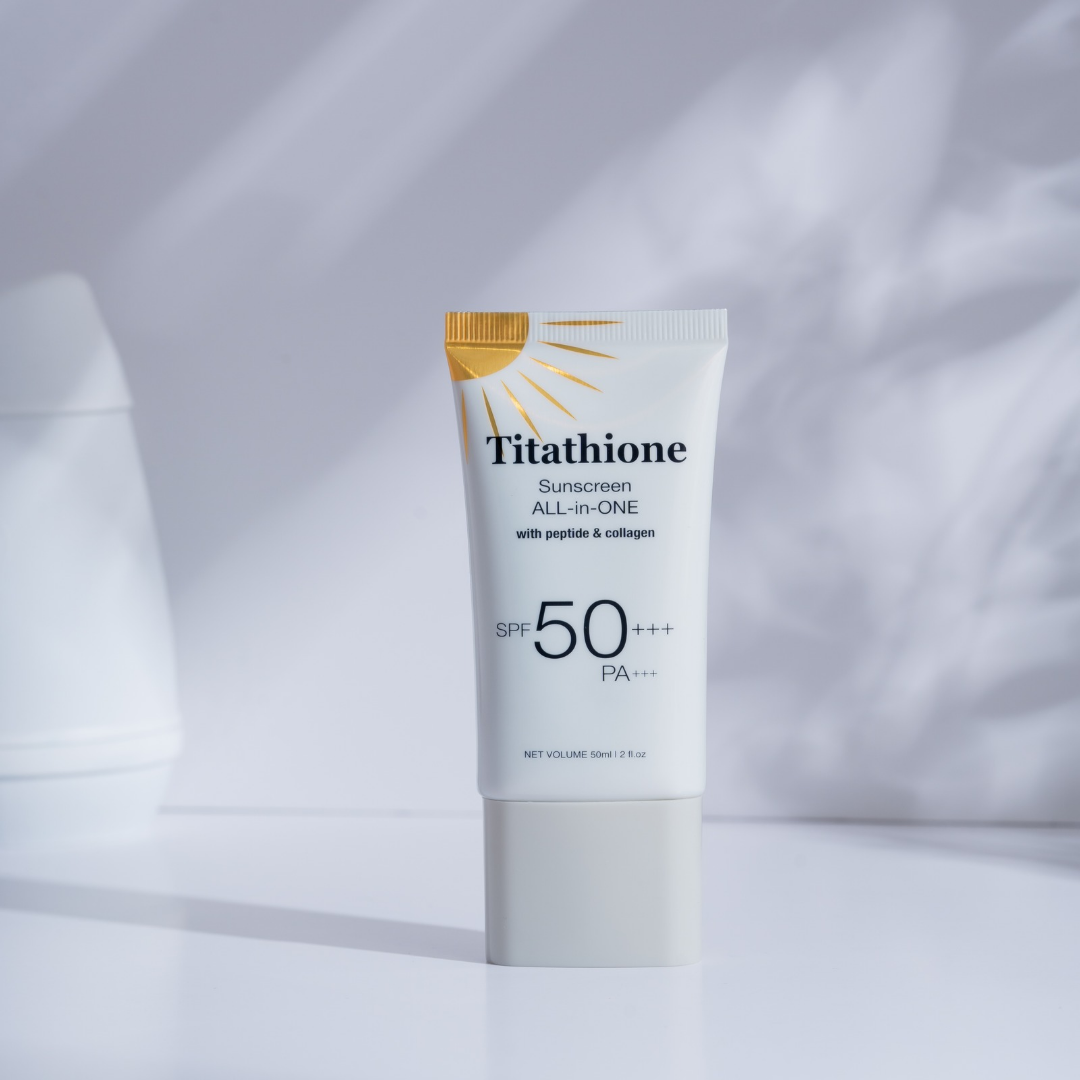 Shield your skin from the harsh rays of the sun with Shaheen Beauty TITATHIONE Sunscreen Spf 50/PA+++ w/ Zinc Oxide, Titanium Dioxide and Niacinamide, a potent all-in-one solution for sun protection and skincare.